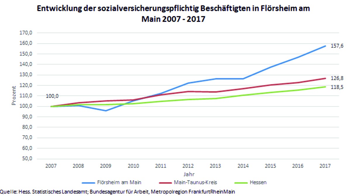 Dass diese Politik in den Jahren meiner Amtszeit erfolgreich war, zeigen die gestiegene Einwohnerzahl und die deutlich angestiegene Zahl der sozialversicherungspflichtigen Arbeitsplätze in unserer Stadt. Nach offizieller Statistik lebten Ende 2018 rd. 22.000 Menschen in unserer Stadt und es gab im Jahr 2017 so viele Arbeitsplätze wie noch nie in Flörsheim am Main, als 5.455 Menschen in unserer Stadt einer sozialversicherungspflichtigen Beschäftigung nachgingen.um ca. 56,7 % seit 2007.